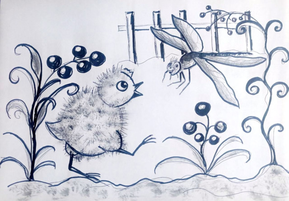 Цыпленок радостно выскочил во двор. Огляделся. А там столько всего интересного! Цветочек на ветру качается, будто здоровается. Пока Ваня кивал ему, загудел большой шмель и на цветок уселся. Удивился Цыпленок, затряс головой, а шмель улетел в сторону леса. Скачет Ваня дальше. Увидел стрекозу на ограде. Подскочил к ней и хотел клюнуть. Стрекоза перелетела через забор, только её и видели.