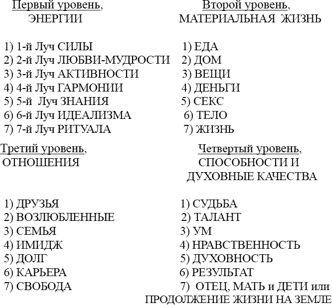 Подсознание похоже на стопки данных, внутри которых скрыты, но работают – различные негативные воспоминания и ошибочно усвоенные убеждения. Чтобы разобраться в том, что спрятано ниже поверхности сознания, наша земная жизнь детализирована и представлена в виде четырех больших уровней: ЭНЕРГИЙ, МАТЕРИИ, ОТНОШЕНИЙ и СПОСОБНОСТЕЙ, каждый из которых содержит по семь тем.