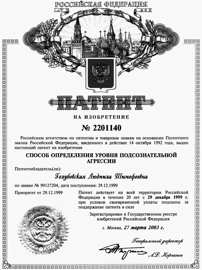 Рис. 1. Патент на изобретение: «Способ определения уровня подсознательной агрессии»