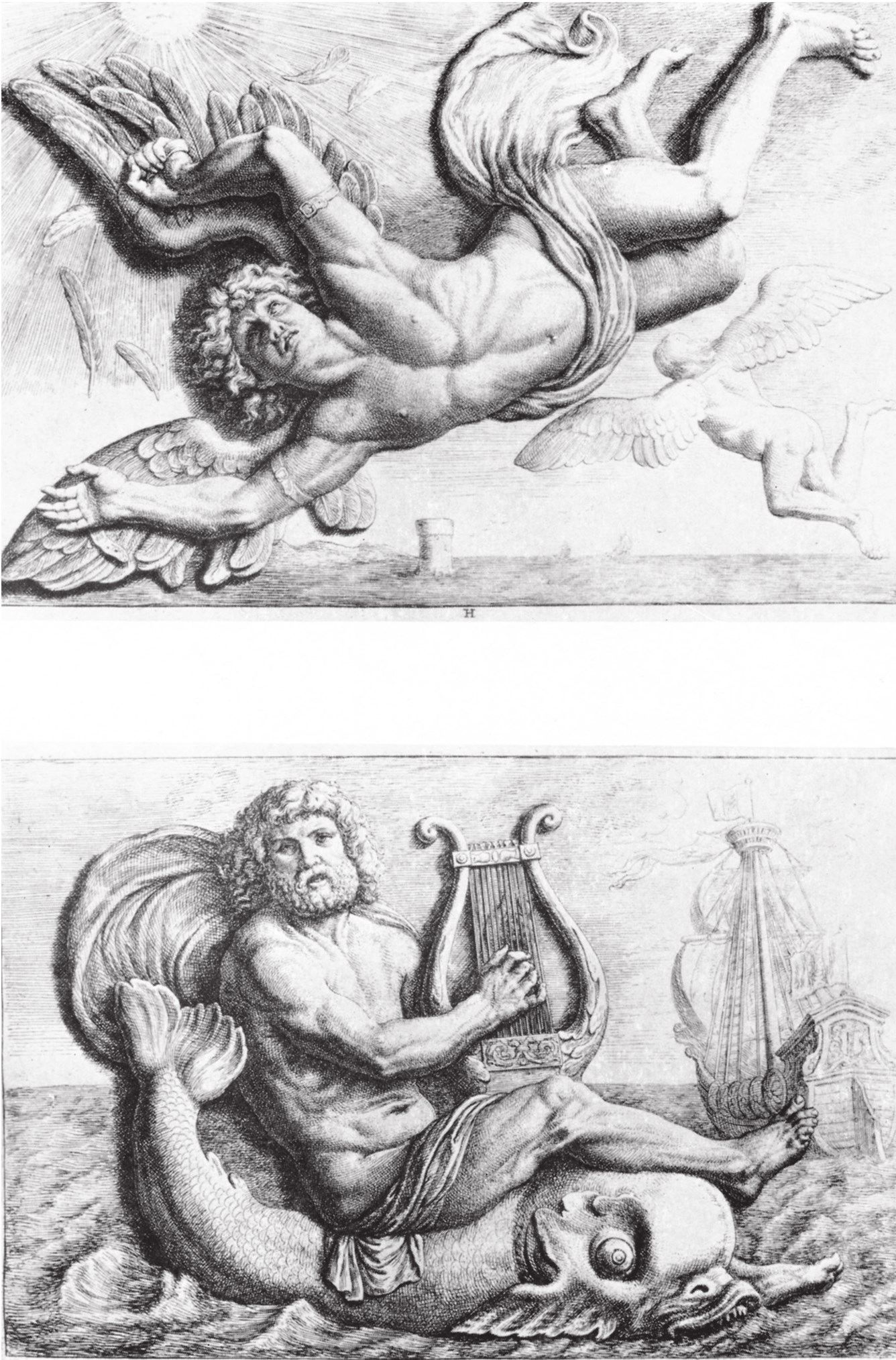 Падение Икара (вверху); Арион на дельфине. Амстердам, Городская ратуша. Гравюра из Title. Afbeelding van’t Stadt Huys van Amsterdam Якоба ван Кампена, 1664
