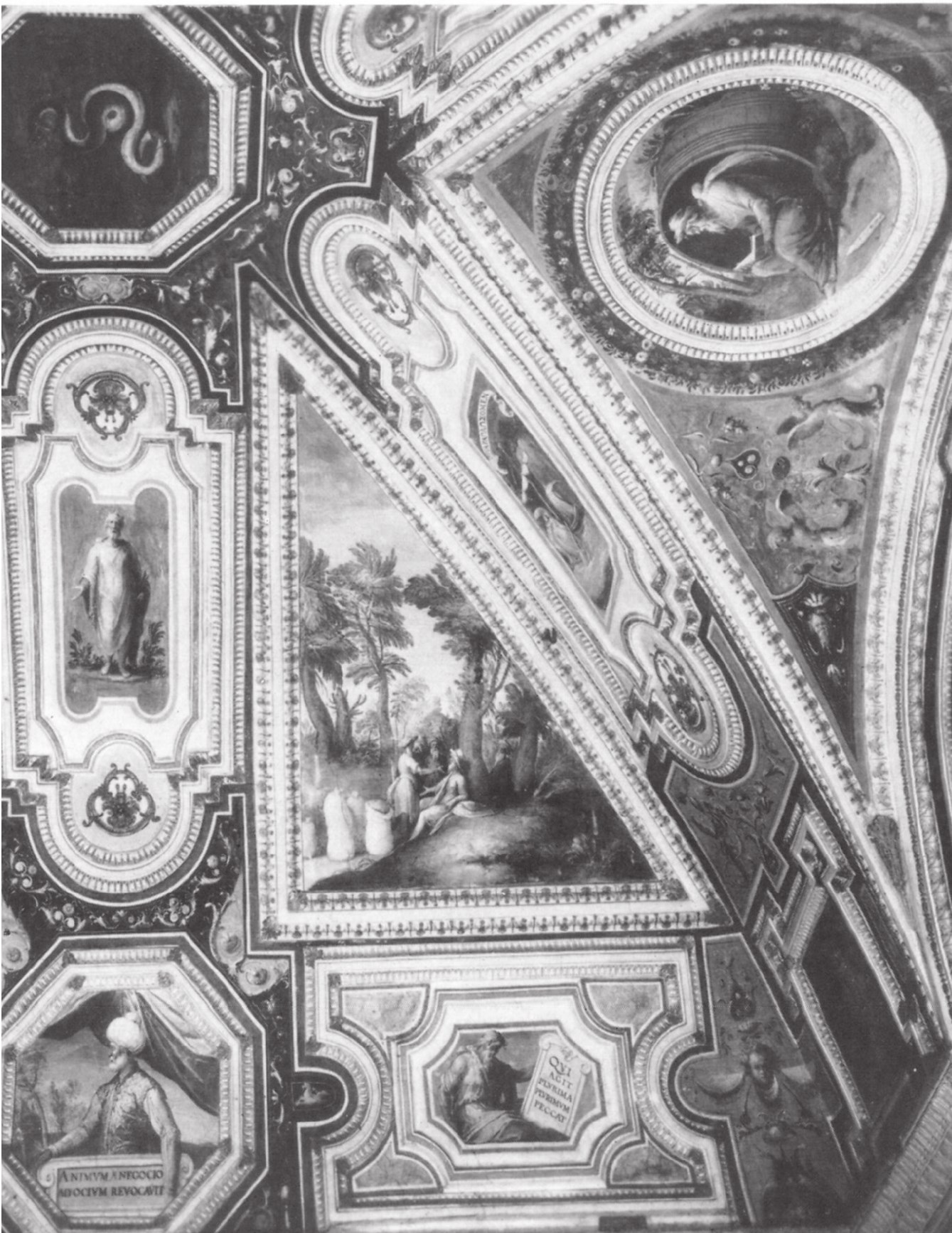 Темы для росписи кабинета светлейшего монсиньора Фарнезе следует приноровлять к расположению художника, либо же ему приноровлять свое расположение к вашим темам. Поелику ясно, что он не желает приноровляться к нам, мы вынуждены приноровляться к нему, дабы избежать путаницы. Оба сюжета, относящиеся к теме, подходят к уединению. Он делит свод на две основных части, поля для историй и орнамент, их окружающий.