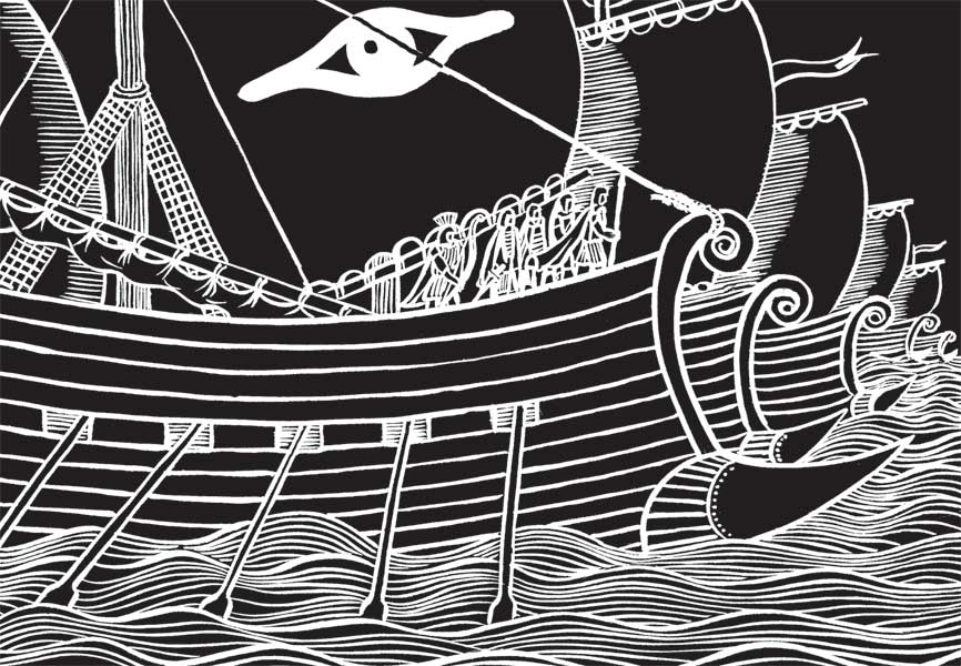 Назовём Элефенора – за то, что абанты, он которых привёл, бились, не выпуская копий из рук, и головы брили, оставляя лишь вихор на затылке. Представим – сорок ладей таких молодцов.