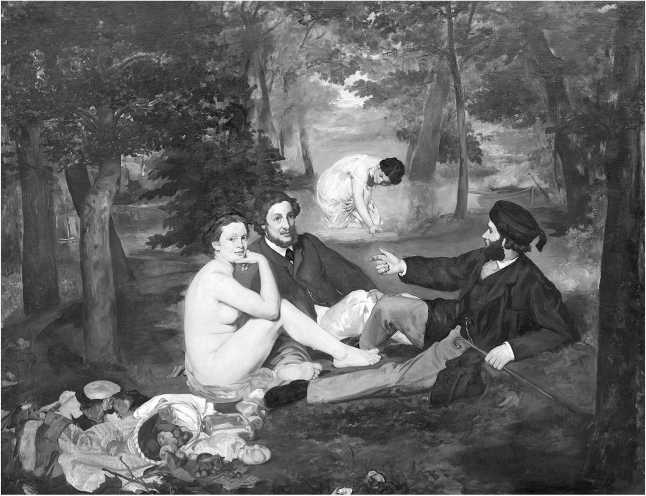 Реакция Академии очень расстроила Мане, однако он не собирался плясать под ее дудку. Он продолжал идти своим путем, отправляя в комитет Салона все новые работы. В 1863 году он представил картину «Завтрак на траве (в то время имевшую название «Купание») (ил. З), до краев наполненную историко-художественными аллюзиями, которую Академия просто обязана была одобрить. Сюжет и композиция были заимствованы с гравюры Маркантонио Раймонди (ок. 1480–1534), за основу которой, в свою очередь, был взят рисунок Рафаэля (1483–1520) «Суд Париса» (этот сюжет вдохновил и фламандца Питера Пауля Рубенса). Просматривается также сходство с «Сельским концертом» (ок. 1510) и «Бурей» (1508), полотнами, которые приписывают сразу двум живописцам – Джорджоне (1476–1510) и Тициану (1487–1576). На этих картинах имеются обнаженные женщины (одна или две), сидящие на траве рядом с хорошо одетыми молодыми людьми (одним или двумя), и над всем этим витает дух невинности и целомудрия. Эти старые полотна отсылают нас к библейским и мифологическим сюжетам, и явных намеков на сексуальную подоплеку там нет.