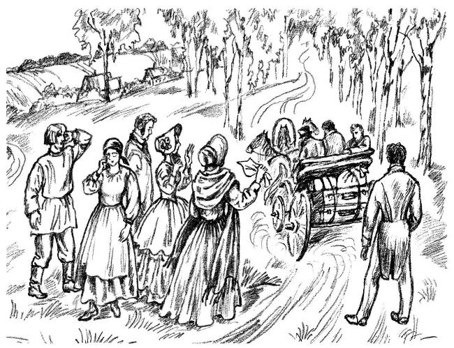Впереди пошли Анна Павловна с сыном и с Поспеловым, потом Марья Карповна с дочерью, наконец священник с Антоном Иванычем. В некотором отдалении ехала повозка. Ямщик едва сдерживал лошадей. Дворня окружила в воротах Евсея.