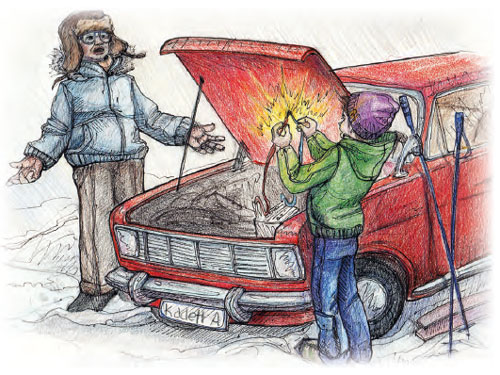 Как назло, «прикурить», то есть завести автомашину с помощью специальных толстых проводов от другого, уже заведенного автомобиля, тоже не получалось. Из знакомых автомобилистов вокруг никого не было, а незнакомые – проезжали мимо, не останавливаясь. Наверное, очень спешили. Дядя Боря тосковал, стоя рядом со своим замороженным автомобилем, держа в руке два провода, синий и красный, уже присоединенные к клеммам мертвого аккумулятора под откинутой крышкой капота.