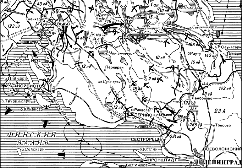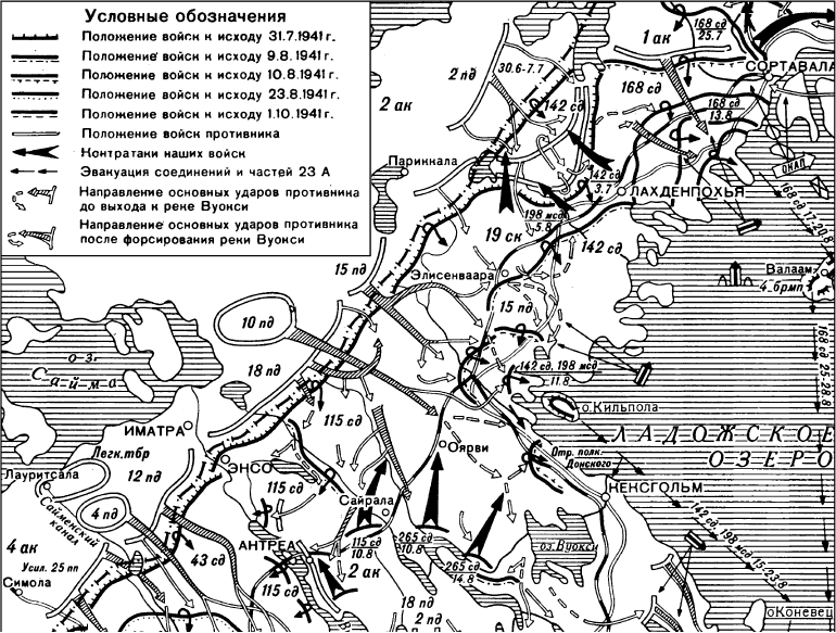 Занятие финнами станций Соммее и Кайслахти 26–27 августа сыграло роковую роль в судьбе выборгской группировки наших войск (50-й стрелковый корпус – 123-я, 43-я и частично 115-я стрелковые дивизии). Попытка контрнаступления 24 августа, проводимая рядом разрозненных ударов с разных направлений, не привела ни к каким результатам – хотя в полосе 18-й финской дивизии на рубеже Яуреппя и озера Муоланярви финнов на некоторое время удалось отбросить к Вуоксе, а «в ночном бою дело дошло до рукопашных схваток с применением финских ножей и ручных гранат».[41]