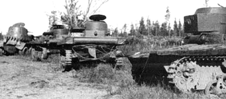 Советские танки Т-38 и бронеавтомобили, брошенные у станции Соммее