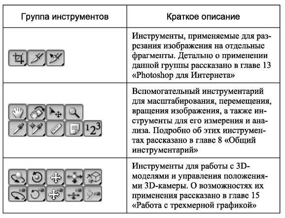 Ниже приводится полный перечень всех инструментов Photoshop CS4 и краткое описание области их применения (табл. 2.1). Более подробно инструменты будут рассмотрены далее.