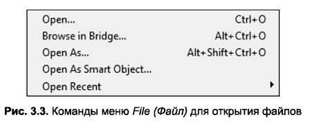 Открыть файл изображения в Photoshop CS4 можно точно так же, как и в большинстве других приложений – например, воспользоваться командами меню File (Файл) (рис. 3.3).