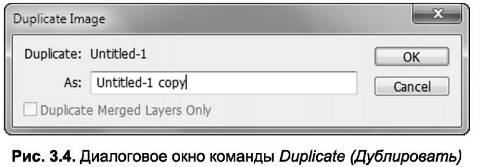 В процессе работы часто требуется создать копию открытого изображения. Для этого удобно воспользоваться командой Image (Изображение) \ Duplicate (Дублировать), создающей новый документ, который является точной копией открытого. По умолчанию копия содержит все слои и альфа-каналы текущего документа, но в диалоговом окне этой команды имеется флажок Duplicate Merged Layers Only (Дублировать только слитые слои), при выборе которого в копию будут добавлены только слитые слои (рис. 3.4). В этом окне также предоставляется возможность задания имени копии.