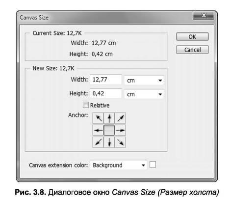Команда Image (Изображение) \ Canvas Size (Размер холста) позволяет увеличить или уменьшить рабочую область вокруг изображения. При использовании команды открывается одноименное диалоговое окно, в котором можно указать параметры для выполняемых изменений (рис. 3.8).