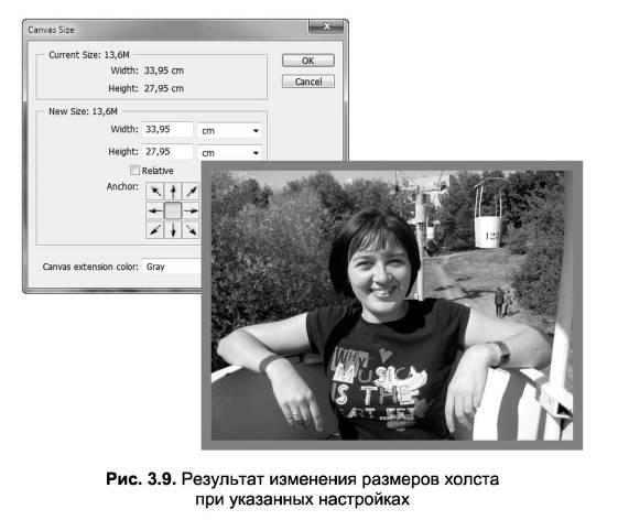В этой же области можно указать направление масштабирования холста при помощи одной из девяти кнопок. По умолчанию выбрана средняя кнопка, соответствующая равномерному увеличению (или уменьшению) размеров холста, что позволяет создать рамку вокруг изображения (рис. 3.9).