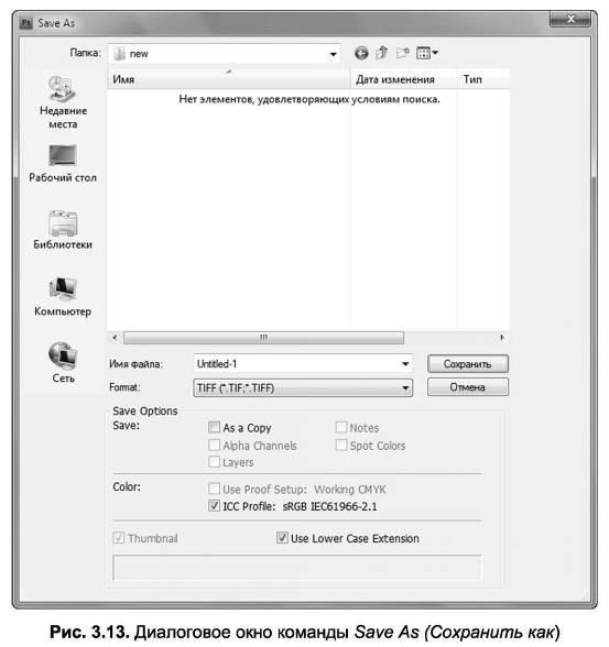 Сохранить изображение в файл можно как при помощи команды File (Файл) \ Save (Сохранить) (сочетание клавиш Ctrl+S), так и командой File (Файл) \ Save As (Сохранить как). Команда Save (Сохранить) сохраняет документ, не отображая диалог сохранения файла. Если же сохраняется новый документ, то вместо Save (Сохранить) будет выполнена команда Save As (Сохранить как), предоставляющая возможность выбора опций сохранения (рис. 3.13):