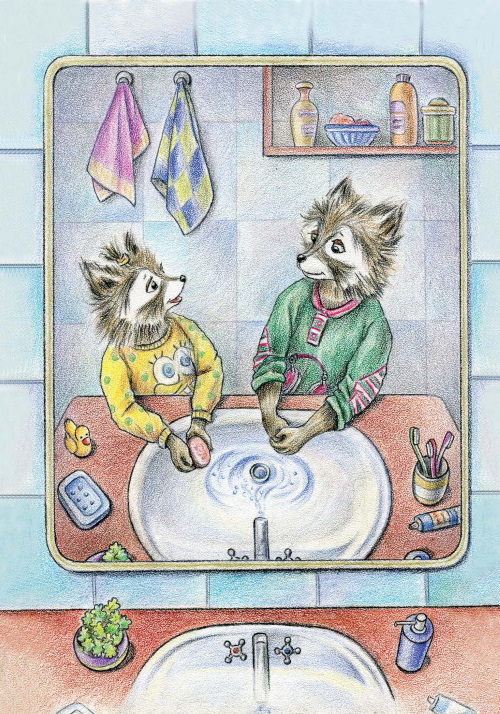 – Еня, будем мыть как следует! – важно сказала Еля. – Надо мыть лапки не меньше двадцати секунд. Нам это в школе рассказали, когда эпидемия ещё только начиналась.