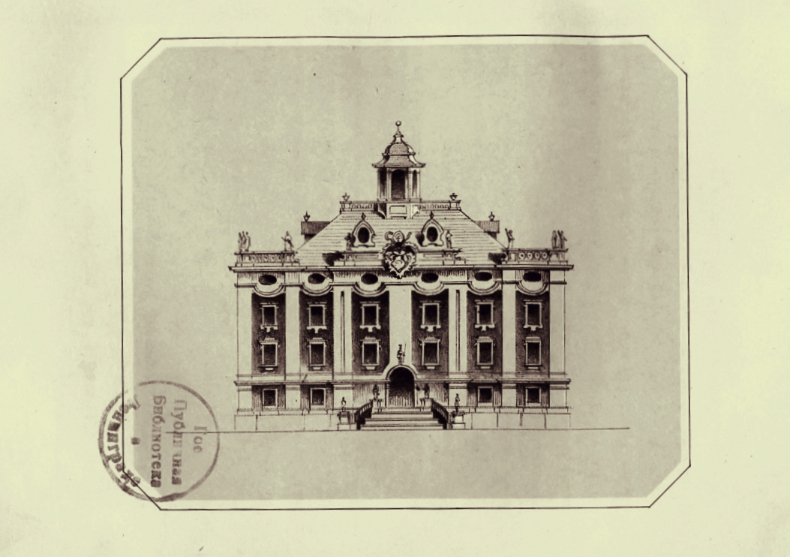 Попов возложил это дело на нескольких из образованнейших чиновников его ведомства, под начальством, сперва статского советника Киршбаума, а потом надворного советника Михаила Ивановича Антоновского, окончившего образование в московском университете, человека неутомимого и, по тому времени, весьма ученого. Пока это временное библиографическое общество, которого чины назывались членами варшавской, а позже Императорской Библиотеки, разбирало и описывало привезенные книги, Императрица Екатерина II повелела придворному архитектору Соколову составить план здания для их хранения на том самом месте, где теперь находится Публичная Библиотека. Первоначально, сооружение это было задумано в огромных размерах, и не для одной собственно Библиотеки, но для совокупления в нем пособий по всем отраслям человеческих знаний, в теории и практике. На вершине здания должна была возвышаться астрономическая обсерватория, для которой Императрица предназначила привезенный тогда из Англии знаменитый гершелевский телескоп; внутри полагались залы для кабинетов древностей и инструментов физических и астрономических. Сверх того, было намерение связать это здание с Аничковым дворцом, посредством великолепного зимнего сада и портиков, украшенных статуями, водометами и снарядами для гимнастических упражнений, так, чтобы рядом с умственной пищей, каждый мог находить себе, под той же крышей, отдых, развлечение и место для прогулки. Существующие еще теперь, на прилегающем к Библиотеке театральном дворе, остатки колонн, долженствовавших поддерживать стеклянную крышу зимнего сада, доказывают, что приступлено было уже и к самим работам.