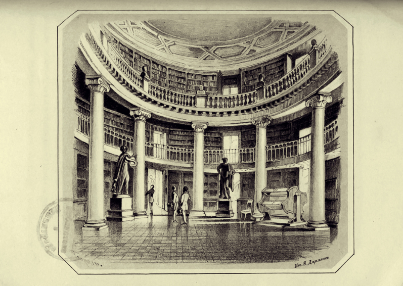 Овальная зала бельэтажа Императорской Публичной Библиотеки. Иллюстрация из путеводителя по Императорской Публичной Библиотеке, 1852 год