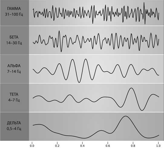 Фрис говорил о гамма-, бета- и тета-волнах. Эти состояния относятся к скорости электрических колебаний в головном мозге, измеряемой электродами, размещенными на внешней стороне черепа. Группы нейронов производят эти колебания, поскольку они используют электрохимические импульсы для связи друг с другом. Скорость и напряжение этих сигналов при усреднении создают волны ЭЭГ, которые можно измерять с частотой сигнатурных циклов в секунду» [2].