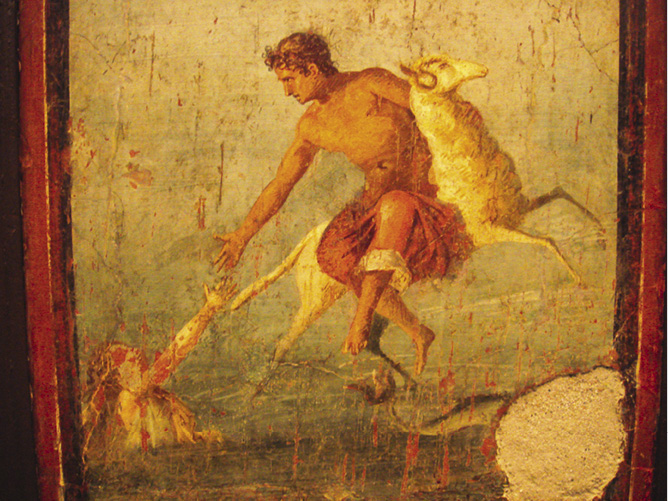 Die beiden Kinder fahren über das Meer und Helle stürzt von dem Widder. Dieser Sturz wird sehr subtil durch zwei Gründe erklärt: die Schwachheit aufgrund ihrer weiblichen Natur (infirma, 870)25 und das mangelnde Können des Mädchens (cornu tenuisse sinistra)26. Wie in Val.Flac. I 291–293Valerius FlaccusVal.Flac. I 291–293 bleibt der Bruder nicht gleichgültig gegenüber dem Sturz der Schwester und versucht, sie zu retten. Zwei Kennzeichen zeigen deutlich die Verzweiflung des Knaben: die ausgestreckten Arme und die Tränen um die verlorene Schwester27. Diese Beschreibung hat weniger Pathos als die von Valerius Flaccus, aber ihre Ausdrucksstärke ist so besonders, dass Frazer sogar zu sagen wagt: „Ovid writes as if he had a picture of the scene before his eyes or in his memory“28. Frazer weist auf ein Fresko in Pompeji hin, das dem von Ovid beschriebenen Bild sehr ähnelt29. In diesem Fresko streckt Phrixos, der auf dem Widder sitzt, der Schwester, die im MeerMeer versinkt, seine Hand hin. Dies ist die Abbildung aus Pompeji30: