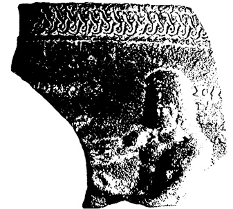 Fuhrmann hat den Becher in einem interessanten Artikel detailliert untersucht. Er ordnet ihn folgendermaßen ein: „Das Material, die Technik der Fertigung, die zu einem fast halbkugelförmigen fußlosen Becher zu ergänzende Gefäßform und die dekorative Ausstattung mit dem Ornament des doppelten Flechtbandes, mit der figürlichen Darstellung in flachem Relief und mit den diese erläuternden Beischriften an der Außenwandung reihen das Fragment ohne weiteres in die Gruppe der‘homerischen’ Becher der sogenannten megarischen Gattung der hellenistischen Reliefkeramik ein“48. Hier ist ein Bild des Bechers:
