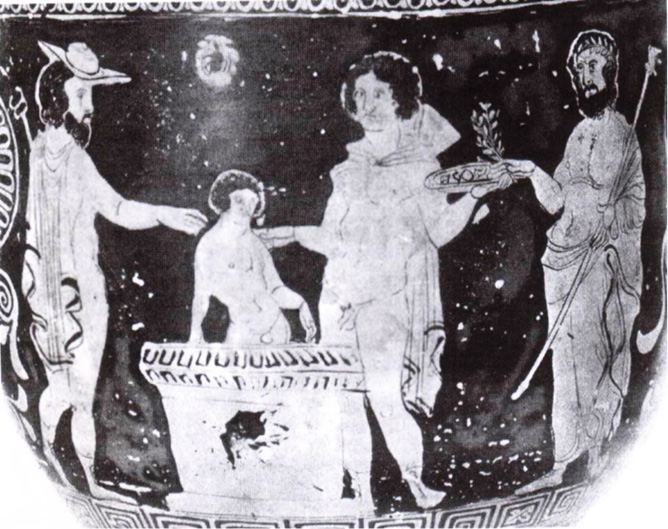 Das Bild zeigt vier Figuren. In der Mitte steht ein Knabe hinter einem Altar, links davon steht ein bärtiger Mann, mit Himation, Petasos und Caduceus, den Trendall, meiner Meinung nach treffend, als HermesHermes interpretiert; dieser Mann streckt seine Hand in Richtung des Knaben. Rechts von diesem befindet sich ein anderer bärtiger Mann mit einem Zepter in der Hand. Der junge Mann neben dem Altar, der einen Umhang trägt und dem zentralen Knaben nah ist, könnte ein Helfer beim Opferungsritus sein.