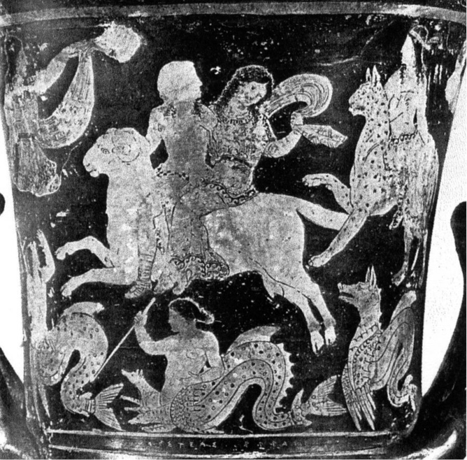 In der Mitte des Kraters sind Phrixos und Helle18 zu sehen, die auf einem riesigen, ehemals wahrscheinlich weißen und goldenen Widder sitzen. Trendall entscheidet sich eher für den Flug als für die Schiffahrt, denn er schreibt listig, der Widder „[is] flying over the sea, represented pictorially by a Triton, a Scylla, a sea monster and seven small fish“19. Nach diesem Forscher stellen Scylla und Triton die Meerwelt und nicht das Böse dar, wie es anderswo angedeutet wurde. Links oben steht Nephele, von deren Beischrift vier Buchstaben (ΝΕΦΕ..) erhalten sind; sie breitet einen Umhang, ähnlich einer WolkeWolke, aus, um ihre Kinder zu beschützen. Schaunberg meint, dass Nepheles Oberkörper „einer Silenbüste entspricht“20. In der gegenüberliegenden Ecke ist Dionysos zu sehen, von dessen Namen nur die beiden letzten Buchstaben (……ΟΣ) erhalten sind; er sitzt auf einem Panther, hinter ihm ein alter Silen. Die Szene ähnelt – Trendall weist darauf hin21 –, dem Anfang der 3. Fabel von Hygin. Nach der Hypothesis des zweiten Phrixos von Euripides wäre dieses Bild die letzte Szene des Dramas. Das Problem liegt darin, dass es zwei dei-ex-machina gäbe, Nephele, die den Widder gibt, und Dionysos, der sie verfolgt.