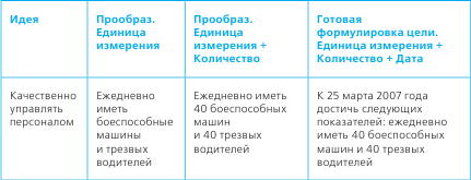 Приведу пример из своей практики. Начальник транспортного цеха одной из крупных компаний г. Нижнего Новгорода пишет себе цель: «Качественно управлять персоналом». Сидит довольный, сделал задание быстрее всех. Прошла всего минута, все еще работают, а он – впереди планеты всей! После получения обратной связи он улучшил свою запись. Вся история его пути представлена в таблице.