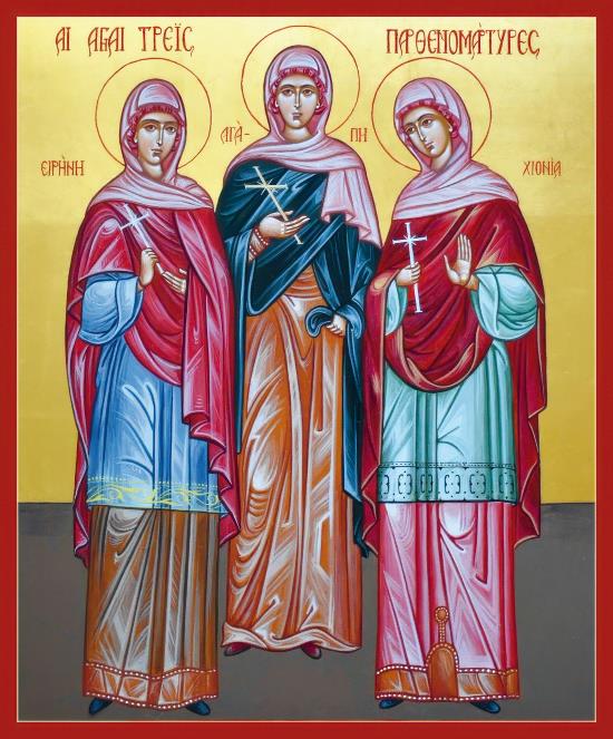 Святые мученицы Агапия, Ирина и Хиония были родными сестрами и жили около большого города Аквилеи в Северной Италии. В юном возрасте потеряв родителей, они решили не выходить замуж и жили в благочестии и чистоте под духовным руководством священника Зинона. Ему было открыто в сонном видении, что скоро он умрет, а святых дев возьмут на мучение. И вот Зинона не стало, а император Диоклетиан приехал в свой роскошный дворец в Аквилею. В городе начались гонения на христиан. Увидев юных прекрасных сестер, император обещал найти знатных женихов из своей свиты. Но святые сестры отвечали, что имеют одного Небесного Жениха – Христа, за веру в Которого готовы пострадать.