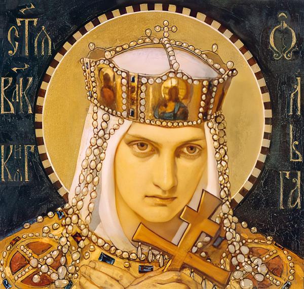 Святая княгиня Ольга была из древнего рода князей Изборских. Родилась она в селении Выбуты под Псковом. Однажды при переезде через реку Великую она познакомилась с молодым Киевским князем Игорем и поразила его своей красотой и мудростью. Князь взял ее в жены и стал жить с ней в Киеве. Когда князь Игорь был убит древлянами, Ольга, еще язычница, жестоко отомстила им. Сын ее Святослав был мал, и она стала управлять своим народом вместо него – с мудростию и милосердием. Княгиня укрепила власть Киевского великого князя, чтобы вокруг него в одну державу стали собираться мелкие местные князья.