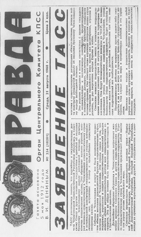 Вчера, 20 августа 1968 г., около 23 часов, войска СССР, Польской Народной Республики, Германской Демократической Республики, Венгерской Народной Республики и Народной Республики Болгарии перешли государственную границу ЧССР. Это произошло без ведома президента республики, президиума Национального собрания, президиума правительства и первого секретаря ЦК КПЧ и всех этих органов. Все эти часы проходило заседание президиума ЦК КПЧ, посвященное подготовке XIV съезда партии. Президиум ЦК КПЧ призывает всех граждан сохранять спокойствие и не оказывать сопротивления продвигающимся войскам, поскольку сейчас защитить наши государственные границы невозможно.