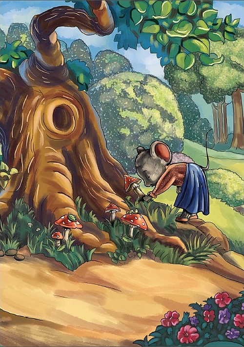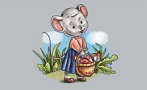 Мышка Дуся вышла из дому и, напевая песенку, зашагала к лесу.