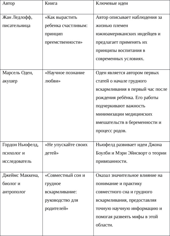 Разумеется, были и другие специалисты, внимание которых так или иначе было направлено на отношения родителей и детей раннего возраста. В таблице ниже я привела самых известных авторов, а так же кратко описала труды и идеи, что они привнесли.