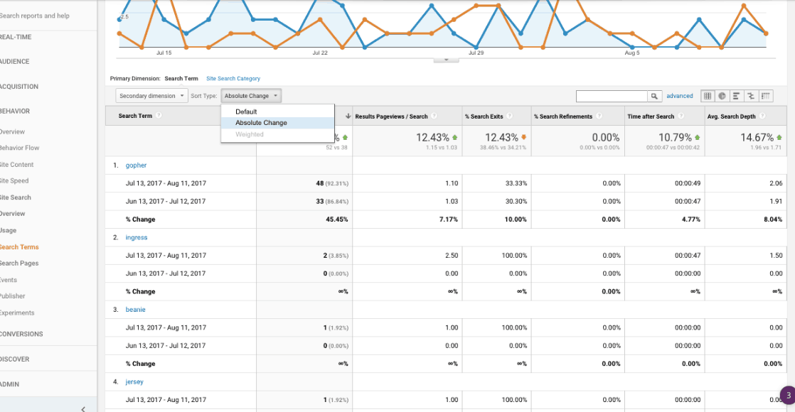 Для этого нужно провести сравнение различных периодов времени, а затем отсортировать по параметру "Абсолютное изменение", изменив значение по умолчанию. Это покажет вам, какие запросы стали появляться чаще по сравнению с предыдущим периодом (и если есть что-то стоящее в этом, возможно, вам нужно подумать о создании контента вокруг этой темы):
