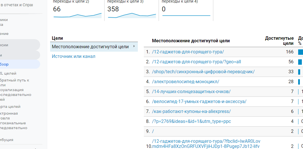 Чтобы просмотреть результаты, откройте вкладку Конверсии>Цели>Обзор. Это список страниц, на которых зафиксированы конверсии.
