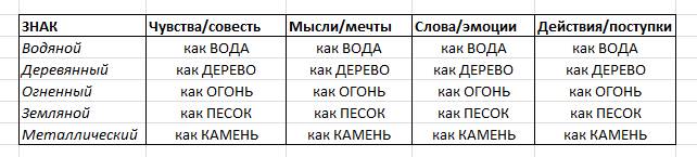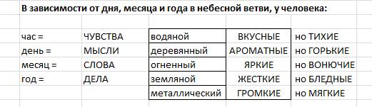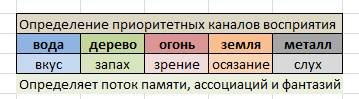 Пять каналов восприятия делятся на пять стихий гороскопа, и определяют доминирующие из них на каждой репрезентативной ступени. С помощью этой таблицы, можно легко определить в каком виде мыслит человек, что стимулирует его поток сознания, какие раздражители вызывают в нем наибольшие ассоциация. Так у людей, рожденных в водяной день мудрость будет проявляться через вкусы, рожденных в деревянный день – дружба через запахи, рожденных в огненный день – веселье через картинки, рожденных в земляной день – деловитость через прикосновения, рожденных в металлический день – власть через звуки. То же самое касается и месяца для общения и года для поступков. Эта таблица раскрывает индивидуальный подход к каждому человеку гораздо более полнее и шире, чем обычные методы НЛП.