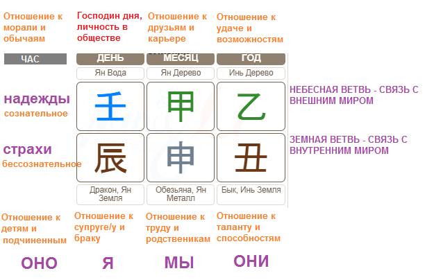 Условно гороскоп каждого человека нужно рассматривать с трех разных видов: 1) это горизонтальное сочетание стихий: между земной и небесной ветвями, 2) это вертикальное сочетание стихий так же между земной и небесной ветвью в каждом отдельном столбе: дня, месяца и года, 3) и перекрестное сочетание стихий между разными столбами и ветвями, так называемые боги или устремления, которые мы рассмотрим чуть ниже более подробно. Лучше всего начинать изучать гороскоп человека от стихий, которые сочетаются друг с другом или повторяются, – это будут его таланты и силы. А затем постепенно переходить к стихиям, которые не сочетаются друг с другом, это будут его слабости и недостатки.