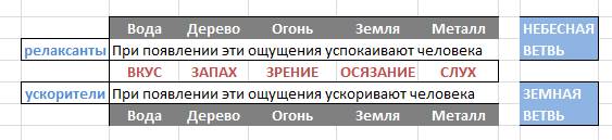 Восприятие информации происходит через конкретные каналы: вкус – это водяная стихия, обоняние – это деревянная стихия, зрение – это огненная стихия, осязание – это земляная стихия, слух – это металлическая стихия. В связи с этим можно предположить, что: 1) вкус создает запах и разрушает зрение, 2) запах создает зрение и разрушает осязание, 3) зрение создает осязание и разрушает слух, 4) прикосновение создает слух и разрушает вкус, 5) слух создает вкус и разрушает запах. Такая связь никогда не поднималась в классической психологии, но очевидно, что она истина. Посредством такого разделения можно легко манипулировать восприятием человека, дополнив те данные, которые упускают техники НЛП.