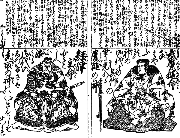 Воинские божества Фуцунуси-но микото (слева) и Такэмикадзути-но микото (справа). Со старинной гравюры