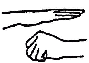Что же касается буддизма, то японским лазутчикам, без сомнения, была известна мудра – символическая поза (комбинация их пальцев и т. д.) – невидимости – онгё-ин, один из вариантов которой входит в знаменитые «девять знаков» – кудзи-ин. В классическом варианте этой мудры, присутствующем на многочисленных изображениях Будды, левая рука образует неплотно сжатый кулак с «отверстием» у большого пальца, а правая в положении ладонью вниз нависает над левой.