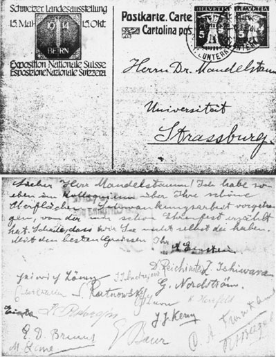 Открытка, отправленная в 1913 году Эйнштейном из Цюриха в Страсбург: «Дорогой г-н Мандельштам! Я только что рассказал на коллоквиуме о Вашей красивой работе по флуктуациям поверхности, о которой мне сообщил Эренфест. Жаль, что Вас самого тут нет». Рядом с подписью Эйнштейна расписались участники его семинара.