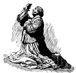 Крестится, кланяется в землю, стукаясь большим лбом о половицу, и, снова выпрямившись, говорит внушительно: