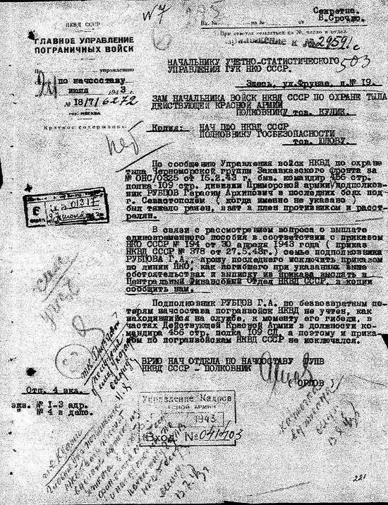 Благодаря этому документу можно достаточно точно определить, к какому силовому ведомству относился полк, которым командовал подполковник Г.А. Рубцов, а также как погиб этот отважный офицер. К слову сказать, подполковника Г.А. Рубцова нет в «Книге Памяти пограничников, погибших и без вести пропавших в годы Великой Отечественной войны 1941–1945 гг.».