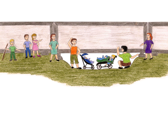 – А тут красиво! ― донеслись до мам детские голоса. Те как раз пролезали под забором с малышами на руках.