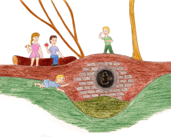 Тётя Юля выбралась наружу. Ребята увидели, что труба под землёй не очень длинная. Солнечный свет не проходил её насквозь, потому что она шла под наклоном. Но дальний конец был виден вполне отчётливо.