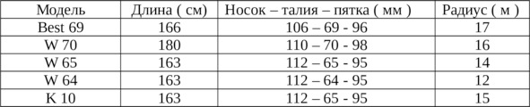 Геометрия «носок – талия – пятка» (ширина в мм) определяет параметр, называемый радиусом бокового выреза (измеряется в метрах). Это как бы радиус окружности, касательной к боковой поверхности лыж. Большинство лыж имеют очень сложную форму бокового выреза, так называемую многорадиусную или параболическую. Многие фирмы указывают боковой вырез, как основной критерий для подбора лыж. Лыжи с большим радиусом бокового выреза более стабильны в больших дугах. Малый радиус позволяет совершать частые сопряженные повороты. Эта характеристика довольно точно показывает какое поведение можно ожидать от лыж на склоне (таблица №1).
