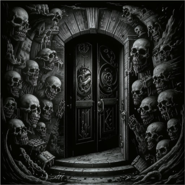 Я жил мечтал искал ответ,О как устроен белый свет,Я был учёный муж простой,Но был со светлой головой,И вот моих трудов потуги,Бессонные ночи душевные муки,Болезненный вид болезненный взгляд,В конечном итоге явил результат,Я выстругал арку из костей человека,Я знаю я грешен мне похуй на это,Я буду гореть на вечном огне,Важней результат душа не в цене,Снимал с людей кожу,Чтоб сделать в ад дверь,И делал узоры из глаз и ногтей,И вот эта дверь готова теперь,И вот я стою перед ней со свечами,Читаю я мантру с пустыми очами,Дверь отворилась ко мне подошёл,Лохматый рогатый какой-то козёл,Схватил меня демон руками за плечи,Сломал мою шею меня искалечив,Сказал мне пройдёмте и выдавил глаз,И тело моё понёс в дверь гандурас,И вот я бездушный плачу в мученьях,Плоть вся истерзана нет моей тени,Запомни мой друг неси в поколенья,Душа всех важней чем изобретенья.