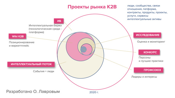 Олег Лавров: «Да. Спасибо, Павел. Я бы использовал слово „сотворить“. Или „создать“. Если бы мы хотели сейчас как-то активно влиять, мы бы совершенно по-другому построили логику и наши предложения. То есть мы продолжаем хотеть со-творять, делать совместно. То, что называется в английском co-creation, когда мы интуитивно уверены в том, что вместе сделаем лучше, чем каждый по отдельности. Сотворчество – наш основной подход интеллектуального производства, и мы – люди, привыкшие этим заниматься каждый день. Это наша норма. Мы это делаем для себя локально, кто-то для сегмента. Но почему-то мы это не сделали для рынка. Нашего рынка. И вот еще раз скажу: наша некая настойчивость в отношении выделения K2B – это, конечно же, формальная сторона дела. Потому что пока очень сложно описать, что это за рынок. „Рынок интеллектуальных услуг“ – узко. „Рынок интеллектуального предпринимательства“ – широко. „Knowledge-Intensive Business Services“ – непонятно. Я не могу сказать, что K2B это прям понятно, но, во всяком случае, с этой логикой хотя бы знакомы по моделям B2B, B2C, P2P, H2H…».