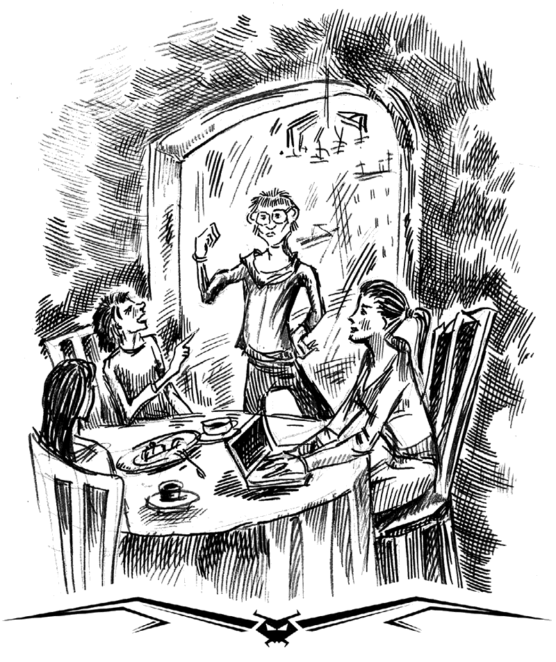 Дашуля, отхлебывая кофе, писала эсэмэски своему Алексу, а Влада, мучая стакан с кислым гранатовым соком, изо всех сил пыталась скосить глаза, чтобы прочесть хотя бы пару слов из блокнота, в котором Жорик что-то чертил: полукруг или квадрат, по сторонам написаны странные буквы, закорючки, знаки…