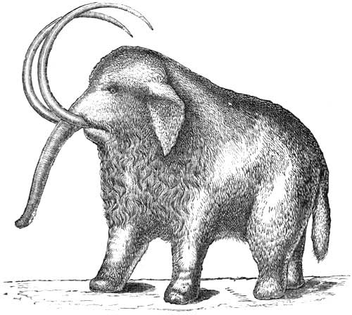 Это мамонт, Elephas primigenius из Блюменбаха, гигантский слон почти на треть выше, чем самый крупный современный вид, и в два раза больше его весом. Его тело было защищено от суровости полуарктических условий, в которых оно процветало, благодаря густому покрытию из красноватой шерсти и длинных черных волос, а его голова была вооружена или украшена клыками длиной более двенадцати футов, любопытно изогнутые на три части круга. Эта слоновая кость долгое время была и остается ценным предметом торговли, особенно в северо-восточной Азии и в заливе Эшшольц в Северной Америке, вблизи проливов Беринга, где иногда обнаруживаются целые скелеты и где даже характер его пищи был установлен благодаря находкам непереваренного содержимого желудка.
