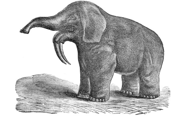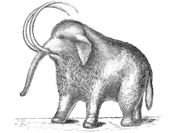 Это мамонт, Elephas primigenius из Блюменбаха, гигантский слон почти на треть выше, чем самый крупный современный вид, и в два раза больше его весом. Его тело было защищено от суровости полуарктических условий, в которых оно процветало, благодаря густому покрытию из красноватой шерсти и длинных черных волос, а его голова была вооружена или украшена клыками длиной более двенадцати футов, любопытно изогнутые на три части круга. Эта слоновая кость долгое время была и остается ценным предметом торговли, особенно в северо-восточной Азии и в заливе Эшшольц в Северной Америке, вблизи проливов Беринга, где иногда обнаруживаются целые скелеты и где даже характер его пищи был установлен благодаря находкам непереваренного содержимого желудка.