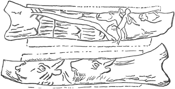 Рис. 19. Гравюра палеолитического человека на роге северного оленя.80 (Здесь представлены две стороны одного и того же рога).